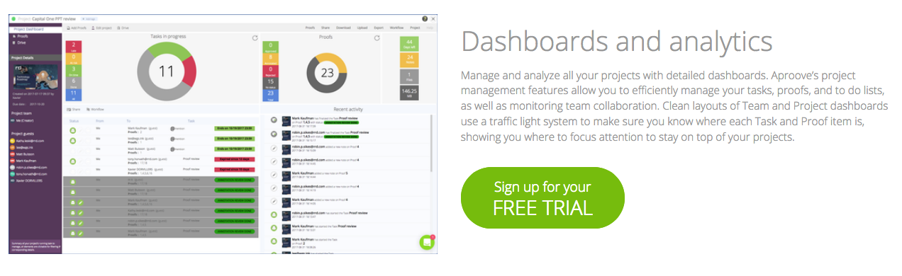 Aproove est le tout-en-un pour tous vos besoins créatifs opérationnels. Oubliez les échanges d’emails interminables, les Drive Cloud non-sécurisés, les serveurs FTP. Dites “Bonjour” à une solution simple et puissante de workflow.