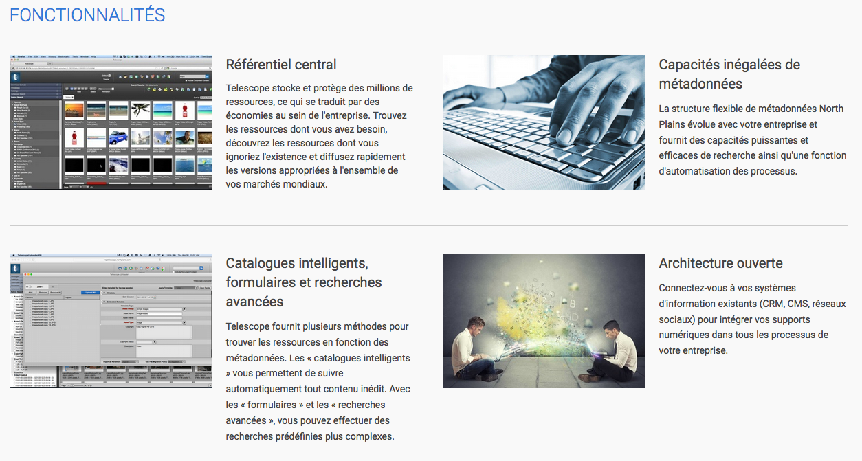 Telescope est la principale solution de gestion des ressources numériques pour les sociétés et organismes qui recherchent un outil d’entreprise solide pour la gestion de millions de ressources liées à différents marchés. Telescope permet aux documentalistes de gérer le volume croissant des ressources numériques de leur entreprise, de manière à réduire le temps passé en recherches, mieux maîtriser des ressources de marque et améliorer l’efficacité et la productivité du service.